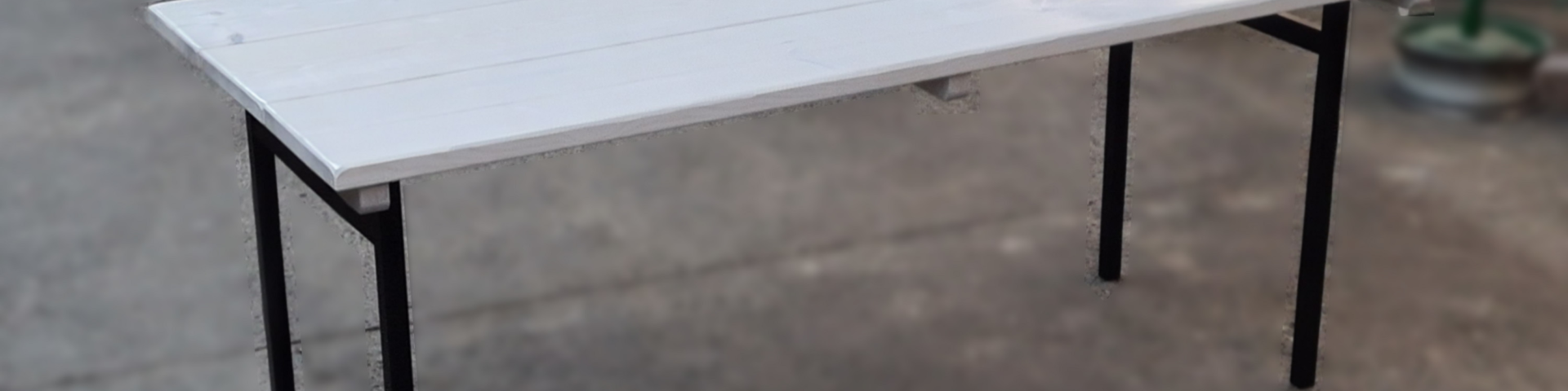 Das Bild zeigt einen Banketttisch mit Bohlen. Der Weiße Bohlentisch in Weiß ist klappbar, die geölte Lasur ist perfekt für den Außenbereich. Bei Öl ist der Vorteil das es bei bedarf nach zu streichen ist, das Teilweise nachstrichen ist ein Problem um Mängel auszubessern.