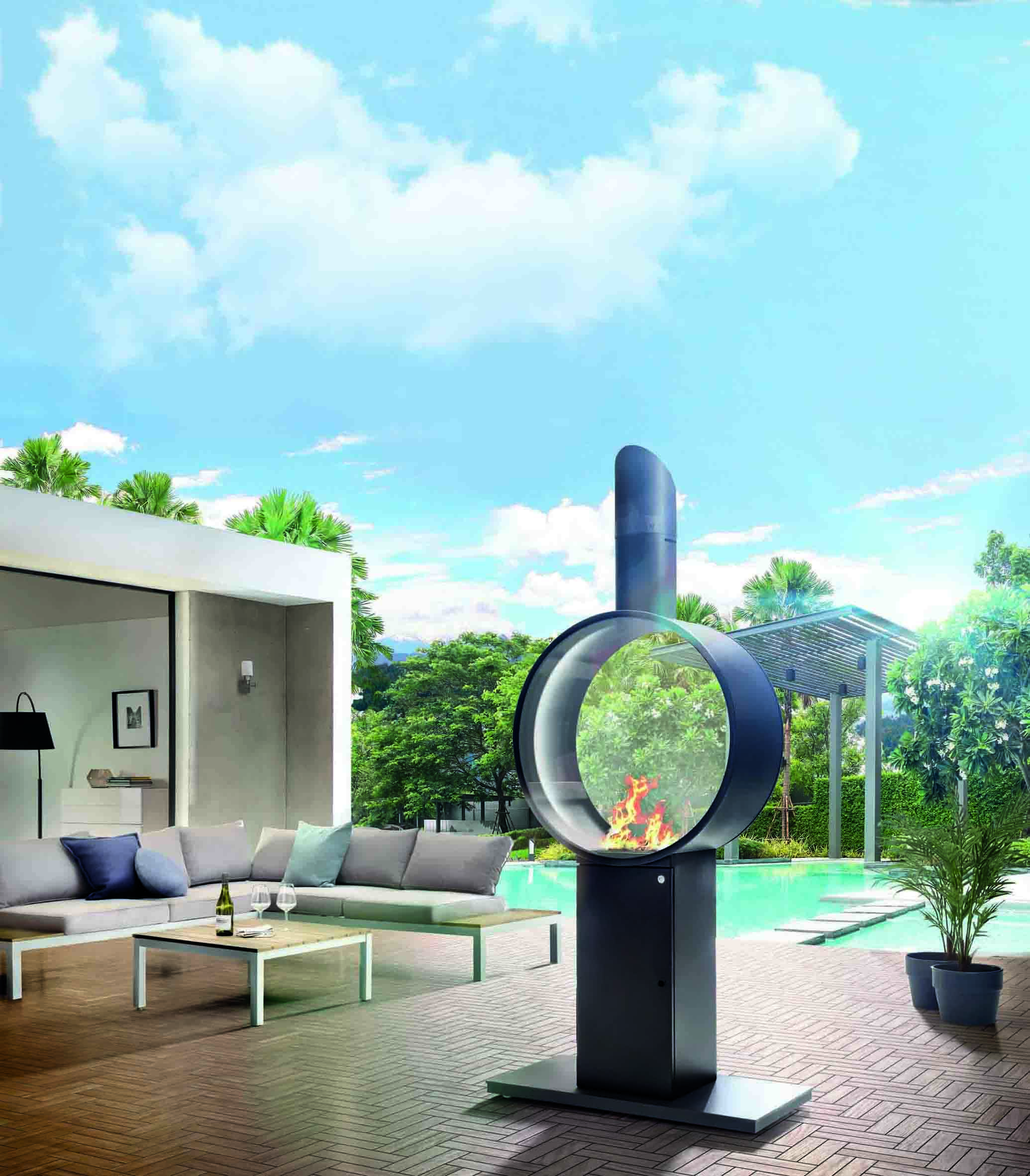 Genau hierfür hat der deutsche Feuerungsspezialist SPARTHERM seine Gaskamine für den Außenbereich entwickelt. So setzt zum Beispiel das Modell FUORA auf einer Höhe von über 2,20 Meter nicht nur außerordentlich schöne Lichtakzente, sondern überzeugt auch mit seiner feinen Formsprache. Ob im Sitzen oder Stehen – der klare Fokus liegt auf dem kreisrunden Feuerraum. Während die dekorativen Lavasteine im Brennerbett dafür sorgen, dass das Flammenspiel seine volle Dynamik entfaltet, bietet die Glaskeramik eine Einsicht im Großformat. Ganz nach dem eigenen Geschmack kann der geschlossene Scheibenkörper dabei als flache oder nach außen gewölbte Variante gewählt werden.