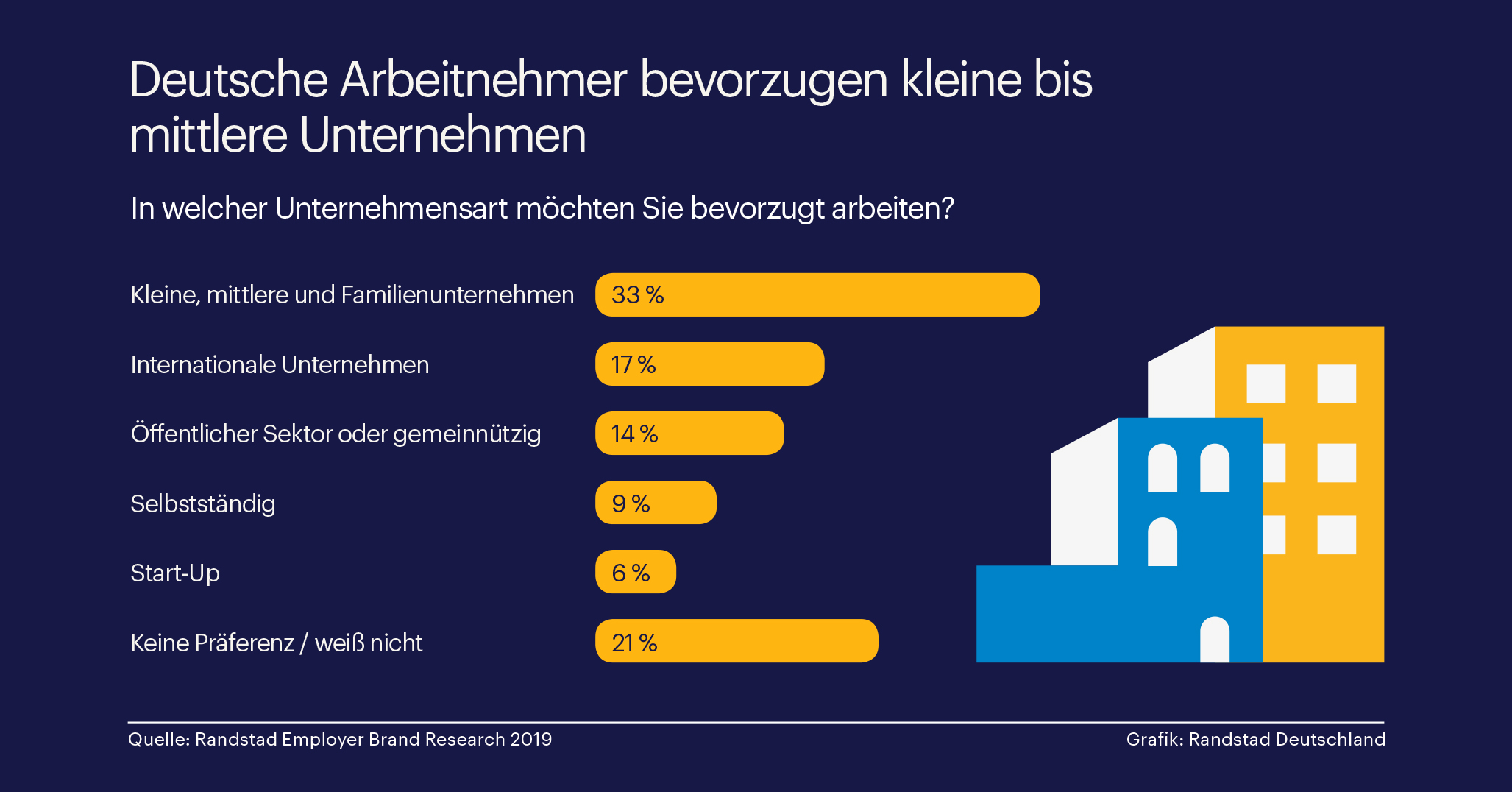 Die drei beliebtesten Arbeitgeber Deutschlands heißen zwar Fraunhofer, Lufthansa und ZF Friedrichshafen – aber in der Summe möchten die Arbeitnehmer in Deutschland lieber im Mittelstand beschäftigt sein. 33% der Befragten nannten kleine und mittlere Unternehmen als bevorzugte Arbeitgeber, nur 17% möchten am liebsten für Großunternehmen tätig sein.
