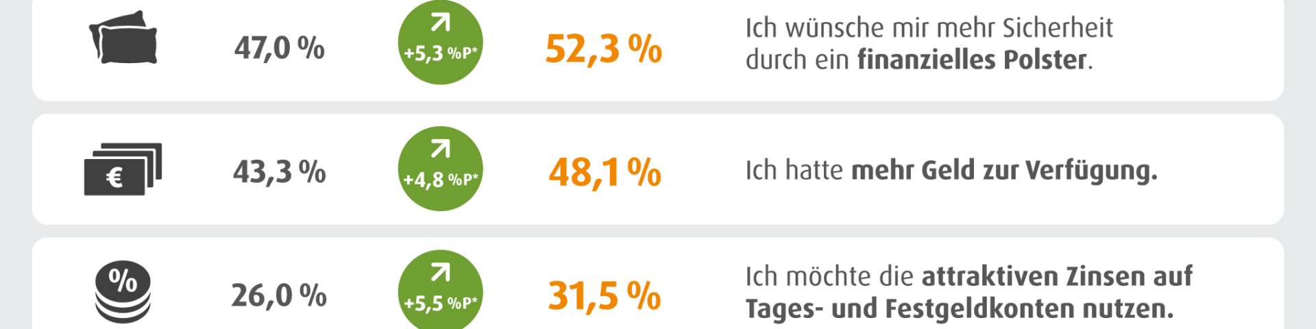 Der Grund dafür ist einfach: Es stand weniger Geld zur Verfügung. Das sagte die Hälfte der Befragten, die 2024 weniger als im Vorjahr sparen konnten (2024: 49,9 Prozent; 2023: 53,7 Prozent). Für ein knappes Drittel waren dringende Angelegenheiten wie Krankheit, Scheidung oder Reparaturen am Haus wichtiger als Sparen – dieser private Aspekt verlor jedoch im Vergleich zum Vorjahr an Bedeutung (2024: 30,5 Prozent; 2023: 38,6 Prozent). Gleichzeitig gewann ein externer Einflussfaktor am stärksten an Bedeutung: Mehr als jede:r zehnte Deutsche gab an, aufgrund weltweiter Krisen ganz bewusst lieber jetzt das Geld auszugeben und das Leben zu genießen – ein Anstieg um 3,3 Prozentpunkte (2024: 12,5 Prozent; 2023: 9,2).