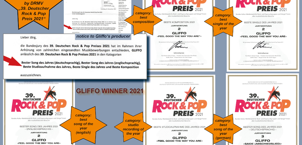 Über eine fünffache Auszeichnung beim 39. Deutschen Rock & Pop Preis 2021 durfte sich der in Bayern beheimatete Musik-Newcomer Gliffo (Rock/Pop) freuen. Der Künstler mit der markanten, sonorigen Stimme wurde bei dem von Deutschen Rock & Pop Musiker Verband (DRMV) initiierten Wettbewerb für die beiden Musiktitel „Saide (Abschiedslied)“ und „Feel Good The Way You Are“ in folgenden Kategorien mit jeweils einer eigenen Urkunde geehrt: