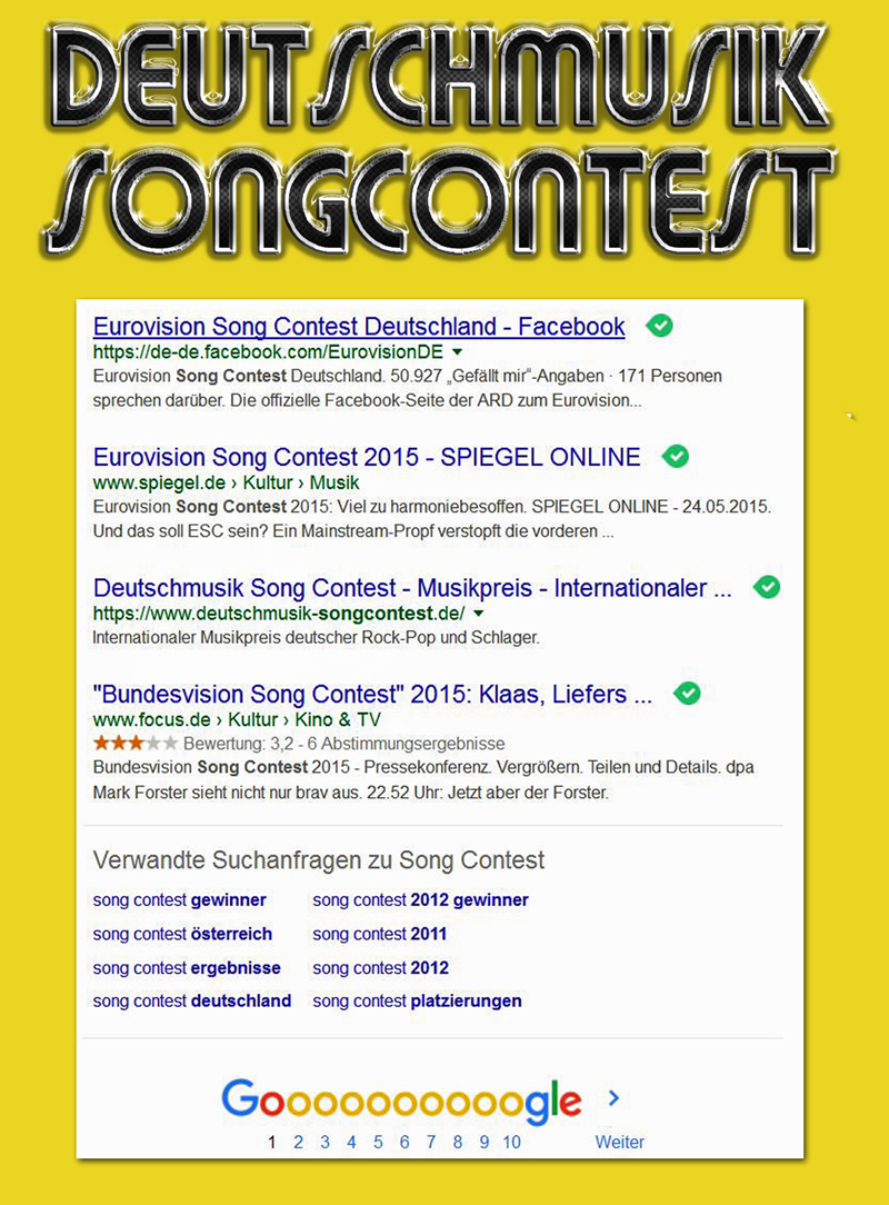 Gladbeck, 21.11.15 „So etwas gab es noch nie: Google lässt den Deutschmusik Song Contest, internationaler Musikpreis deutscher Rock-Pop und Schlager an die Spitze der Gesangswettbewerbe“, so berichtete es am Mittwoch der Deutschmusik Song Contest auf Facebook. Erstmalig wurde unter den Begriffen (spezielle Schlagworte zur Suche im Internet) „Song Contest“ an Topposition nicht nur der Eurovision und Bundesvision Song Contest gefunden sondern auch der Deutschmusik Song Contest. Das Besondere daran: Google hatte noch nie ein anderen Musikwettbewerb auf die ersten Seite der Suchbegriffe „Song Contest“ zugelassen, welche immerhin mehr als 60.000.000 Ergebnisse anzeigt.