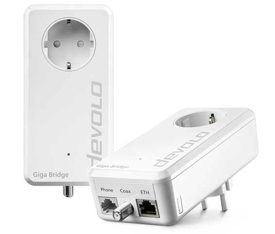 Mit der Giga Bridge bietet devolo Netzbetreibern nun eine clevere Alternative, die aus zwei Adaptern mit integriertem 230-Volt-Pass-Through besteht. Ein Adapter wird in einer Steckdose nahe dem ONT platziert und per Ethernet-Kabel mit ihm verbunden. Dann hat der Techniker des Telekommunikationsanbieters zwei Moglichkeiten: Er kann ein ungenutztes Koaxialkabel oder eine freie Zweidraht- bzw. Telefonleitung mit der Giga Bridge verbinden. Dazu ist der Adapter mit F-Buchse und RJ-45-Port ausgestattet. Ist Teil eins der Bridge nach wenigen Minuten verkabelt, wird der zweite Adapter nahe dem gewunschten Router-Standort eingesteckt, per Kabel mit Telefon- oder Multimediadose verbunden und anschließend per Ethernet-Kabel mit dem Router. Weitere Konfigurationen sind nicht notig, das Pairing zwischen den Adaptern erfolgt automatisch.