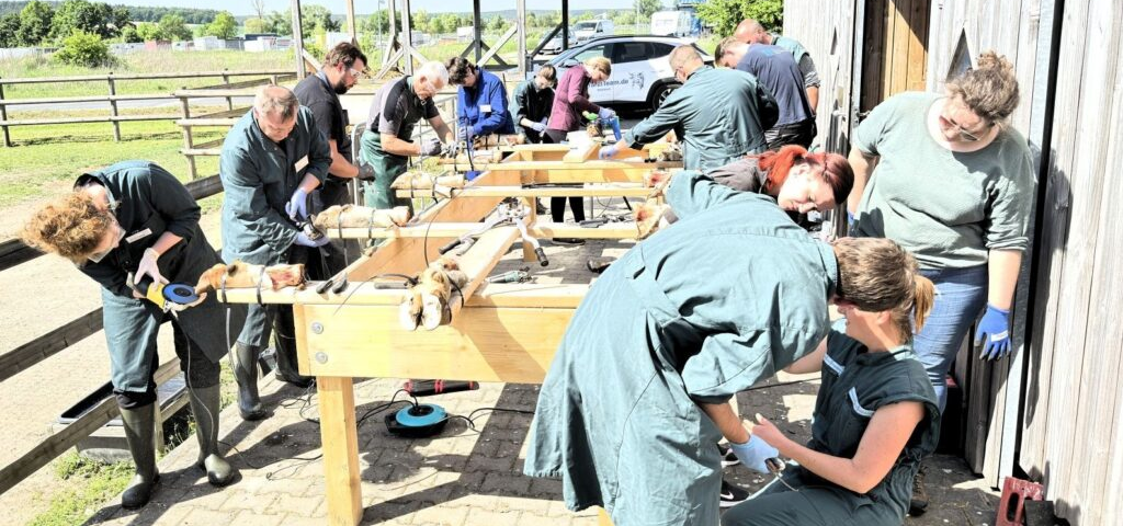 Neben den theoretischen Grundlagen, die Dr. Meis vermittelte, standen für die praktischen Übungen genügend Kuhfüße zur Verfügung, um unter der Anleitung des Klauenspezialisten, Schritt für Schritt, die entsprechenden fünf Arbeitsgänge der funktionellen Klauenpflege zu „üben“, um danach klauenorthopädische Maßnahmen durchführen zu können. Damit die Tierärztinnen und Tierärzte später im landwirtschaftlichen Betrieb mit dem professionellen Klauenpfleger, auf Augenhöhe, die Klauengesundheit und Klauenpflegemaßnahmen zum Wohle der Tiere kommunizieren, anleiten und optimieren können.
