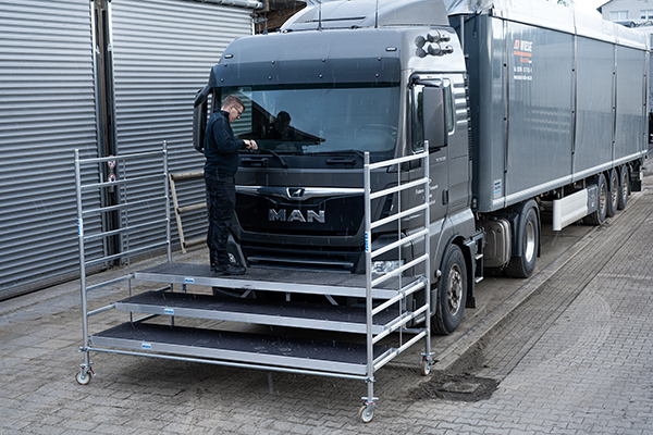 Die Frontarbeitsbühne zum Wechsel großer Windschutzscheiben und anderen Wartungsarbeiten besteht aus drei großen Belagbühnen mit je 3,00 x 0,60 m, die in unterschiedlichen Höhen in die Vertikalrahmen eingehängt werden. Der Aufstieg auf die oberste Ebene ist dadurch, auch mit dem Gewicht einer großen Frontscheibe, mühelos zu bewältigen. Vor allem, da der Austausch dieser Scheiben in der Regel durch zwei Personen durchgeführt wird und die Arbeitsplattform bequem parallel bestiegen werden kann. Oben angekommen haben die Anwender mehr Bewegungsfreiheit als beim Stand auf zwei Leitern, was die Einpassung der Scheibe vereinfacht und für ein optimales Ergebnis sorgt. Erforderliches zusätzliches Werkzeug kann bei Bedarf bereits vor dem Arbeitseinsatz auf der Belagbühne positioniert werden und ist dann ohne einen weiteren Abstieg direkt verfügbar. Bei Bedarf können die Vertikalrahmen darüber hinaus mit der praktischen einhängbaren KRAUSE Ablageschale ausgestattet werden, die Werkzeuge und Kleinteile aufnehmen kann und den Anwendern einfachen Zugriff auf die benötigten Mittel gibt.