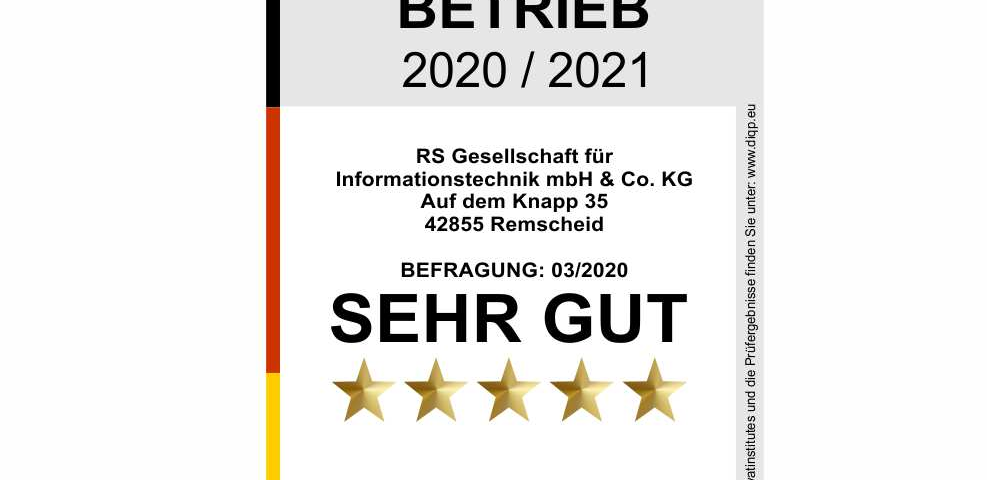 Die RS Gesellschaft für Informationstechnik mbH & Co. KG aus Remscheid wurde vom DIQP (Deutsches Institut für Qualitätsstandards und -prüfung e.V.) im Rahmen einer Zertifizierung mit dem Siegel „Top Ausbildungsbetrieb (DIQP)“ und der Bewertung „sehr gut“ ausgezeichnet.
