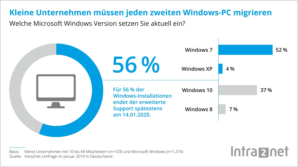 Tübingen, 18.02.2019 – Deutsche Unternehmen stehen 2019 vor erheblichen Herausforderungen hinsichtlich ihrer IT-Infrastruktur. Denn auf 56 % der Desktop-Arbeitsplätze in kleinen Firmen muss in diesem Jahr die Windows-Version aktualisiert werden. Für 47 % der PCs gilt dies zudem für das Office-Paket. Das hat eine Untersuchung des Groupware- und Security-Anbieters Intra2net ( www.intra2net.com) ergeben, der dafür die Zahlen von über 1.200 PC-Arbeitsplätzen in kleinen Unternehmen ausgewertet hat.