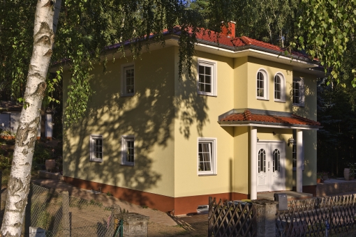 In Berlin-Mahlsdorf harmonieren eine Stadtvilla Lugana und das Landhaus 142 in unmittelbarer Nachbarschaft miteinander. Der vierköpfigen Bauherrenfamilie bietet das Landhaus mit klassischem Satteldach und Trapezgaube 136 Quadratmeter Wohnfläche. Das gesamte Obergeschoss steht den Kindern zur Verfügung. Eine Luft/Wasser-Wärmepumpe sorgt für Heizung und warmes Wasser. Im Unterschied dazu wird die Stadtvilla durch Gasbrennwerttechnik mit Solarunterstützung versorgt. Auf zwei Vollgeschossen mit 151 Quadratmetern Fläche entsteht eine moderne Arztpraxis.