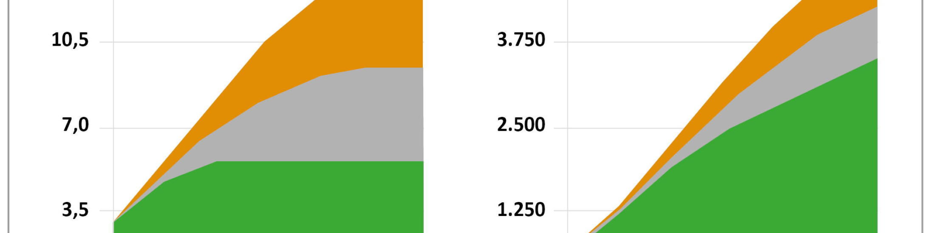 Am anderen Ende des Spektrums verursacht der verzögerte Übergang gegenüber dem schrittweisen Vorgehen Mehrkosten von 3,8 Billionen Dollar. Verglichen mit dem beschleunigten Szenario müssen sogar 7,7 Billionen Dollar mehr aufgewendet werden. Der CO-Ausstoss läge dann mit 51,3 GT bei rund dem Vierfachen des beschleunigten Modells.