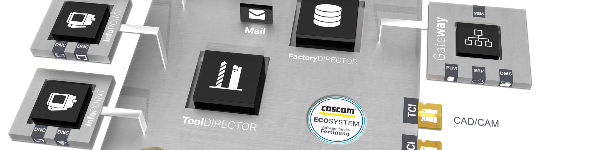 Das übergeordnete strategische Ziel einer modernen Produktion und zugleich größte Herausforderung: Die zentrale Verwaltung, Organisation und Aufbereitung aller benötigten Daten für den Start einer Werkzeugmaschine: NC-Programme, Betriebsmitteldaten und Anweisungen. All diese wertvollen Informationen werden in der zentralen COSCOM Datenplattform vereint und die dafür benötigte IT-Infrastruktur, etwa PLM- und ERP-Systeme, CAD/CAM- und Simulationssysteme sowie Werkzeugmess- und Lagersysteme miteinander vernetzt: Es entsteht ein durchgängiges ECO-System.