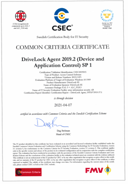 Zertifikat und Report können hier eingesehen werden: https://www.fmv.se/verksamhet/ovrig-verksamhet/csec/certifikat-utgivna-av-csec/drivelock-agent-2019.2-device-and/