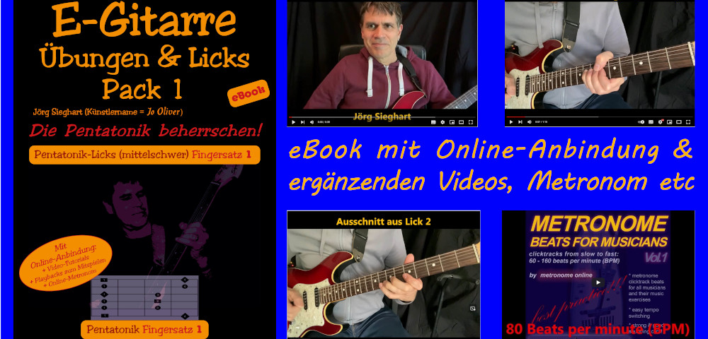 Der Berliner Gitarrist, Musikproduzent und Lehrbuchautor Jörg Sieghart hatte sich speziell zu diesem Thema Gedanken gemacht und ein durchdachtes Lehrkonzept für diese Zielgruppe entwickelt. Um die Verbindung zwischen Buch und ergänzenden Videos interaktiv zu gestalten, hatte er sich für das eBook-Format entschieden: So kann der Nutzer direkt aus dem eBook heraus zahlreiche Erklär- und Vorführ-Videos, ein Online-Metronom sowie ein Playback zum Mitspielen abrufen durch einfachstes Anklicken. Das eBook „E-Gitarre Übungen & Licks Pack 1 – Die Pentatonik beherrschen“ ist quasi mehr ein kleiner Online-Kurs als ein nacktes Buch.