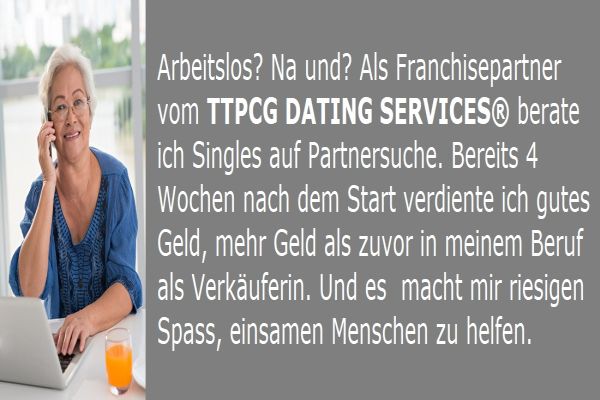 Die zu einem erfolgreichen Start erforderlichen finanziellen Mittel über die geringe Franchisegebühr hinaus, werden von TTPCG DATING SERVICES®, als ein international ausgezeichneter Franchisegeber getragen. Der Einstieg als Nutzer*in dieser Lizenz zum Erfolg ist einfach zu erklären. Im Gegensatz zu vielen anderen Franchise Gebern aller Branchen verdient TTPCG DATING SERVICES® nicht an seinen Franchise Nehmern, sondern gemeinsam mit ihnen. Die wichtigste Voraussetzung zum Erfolg in diesem Team ist, dass sich Berater*innen gerne mit Mitmenschen unterhalten. Denn die Aufgabe in diesem neuen Beruf ist, Damen und Herren zu beraten, die keine Singles mehr sein wollen und sich nach dem Glück und Halt einer harmonischen Partnerschaft sehnen. Als Werkzeuge zu der neuen sicheren Existenz benötigt man lediglich ein Telefon und Laptop. Das Training on the Job kommt bequem nach Hause auf den Laptop.