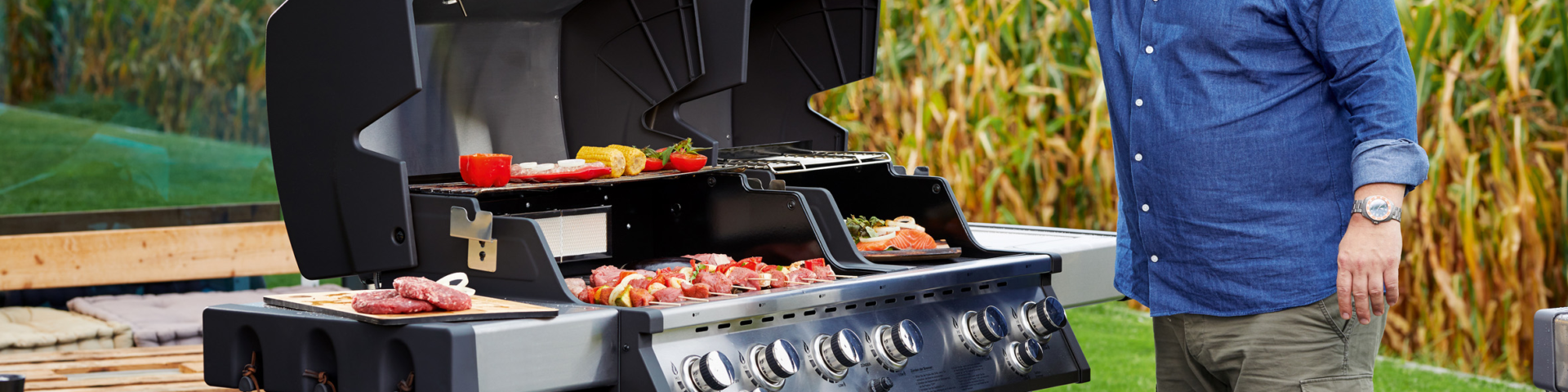Insgesamt wird dieser Gasgrill von sechs leistungsstarken, stufenlos regulierbaren Hauptbrennern, einem Backburner und einem Seitenbrenner befeuert. Unter der linken der beiden doppelwandigen Edelstahl-Hauben mit Thermometer verbirgt sich eine große Grillfläche mit dreiteiligem, herausnehmbarem Gussrost – ideal auch für das Einsetzen eines Wok. Wer richtig einheizen will, schaltet den Backburner für die ganz große Hitze ein. Knuspriges Gyros oder karamellisierte Ananas können hier auf dem Drehspieß ihre Runden drehen. Gleichzeitig wird daneben unter der kleineren Haube schonend und sanft Gemüse, Garnelen oder Fisch gegrillt.