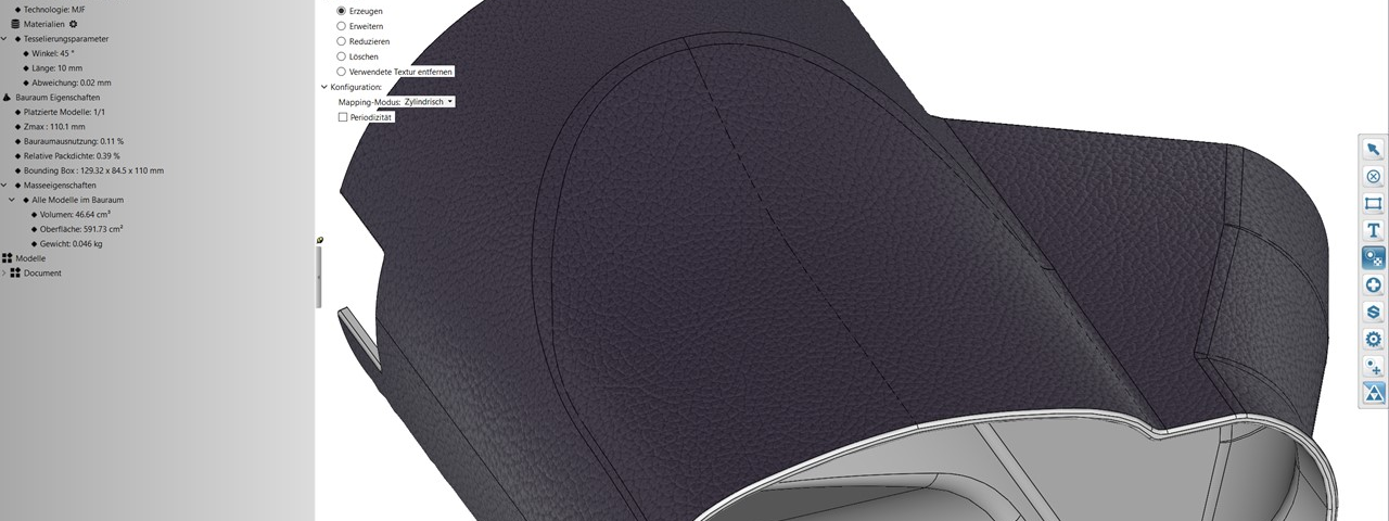 Im Gegensatz zum aufwendigen Prozess der Texturen-Erzeugung im Werkzeugbau erlaubt die additive Fertigung die Oberflächengestaltung mithilfe der Software in wenigen Sekunden auf jeder beliebigen 3D / CAD-Geometrie.