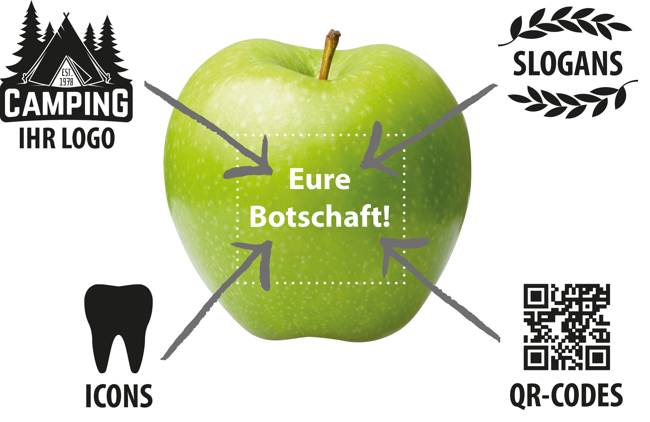 Wie viele Flyer landen im Papiermüll? Digitale Newsletter werden weggedrückt. Ein Apfel mit knackiger Botschaft erregt Aufmerksamkeit und bleibt positiv in Erinnerung. Natürlich sollen gebrandetes Obst und Gemüse gegessen werden – dann sind sie weg, aber die Message bleibt im Kopf.
