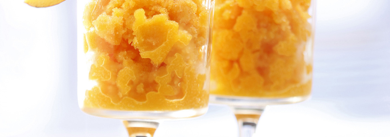 Zitrone auspressen. Zusammen mit Pfirsichnektar, Orangensaft und Zucker purieren und durch ein feines Sieb passieren. Alles in einer flachen Metallschale in den Tiefkuhler stellen: Während des Gefrierens alle 30 Minuten mit einer Gabel umruhren, bis alles zu großen Kristallen erstarrt ist; bei -18°C kann dies etwa 2 Stunden dauern.