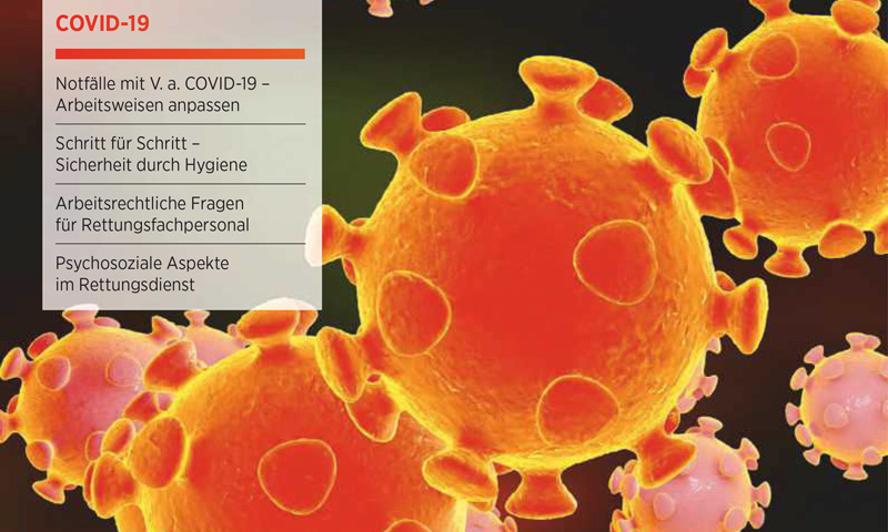 Um Beschäftigte im Rettungsdienst und der präklinischen Notfallmedizin zu unterstützen, bietet die Sonderausgabe von ELSEVIER Emergency eine Zusammenfassung spezifischer Informationen zum Coronavirus (COVID-19) für das Rettungsdienstfachpersonal. Schwerpunkte dieser Sonderausgabe sind „Notfälle mit V.a. COVID-19 – Arbeitsweisen anpassen“, „Schritt für Schritt – Sicherheit durch Hygiene“, „Arbeitsrechtliche Fragen für Rettungsfachpersonal“ sowie „Psychosoziale Aspekte im Rettungsdienst“.