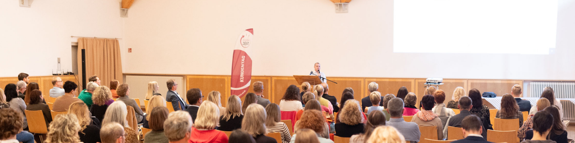 „Uns hat das Ambiente im Kloster Roggenburg gleich gefallen“, so Wolfgang Volz, Geschäftsführer der digital ZEIT GmbH. Da lag es nahe, den geplanten Kundentag im großen Saal in Roggenburg zu veranstalten. „Ich bin überwältigt von der hohen Teilnehmerzahl und freue mich, gerade nach den Corona-Jahren, auf den persönlichen Kontakt und gemeinsamen Erfahrungsaustausch mit unseren Kunden und Interessenten“, meinte Volz bei der Begrüßung. Diesem Angebot wurde in den Pausen zwischen den Vorträgen und neben der hervorragenden Bewirtung der Tagesveranstaltung gerne nachgekommen. Etwa hundert Teilnehmer und Partner kamen dafür nach Roggenburg.