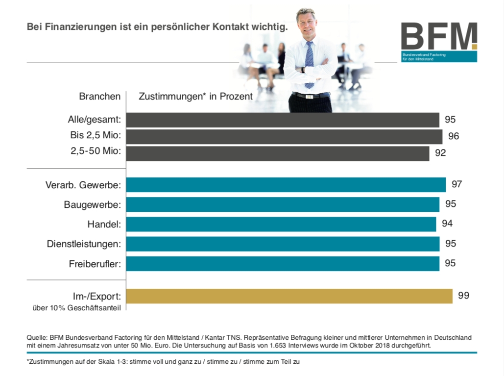 Das Angebot mittelständischer Factoring-Gesellschaften – schnelle Bereitstellung von Liquidität, individuelle Beratung und Services – treffe genau den Bedarf von KMU, so der Verbandsvorsitzende. Wie eine repräsentative Studie unter 1.650 Entscheidern ergab, wünschen sich 95 Prozent einen persönlichen Kontakt bei der Unternehmensfinanzierung. 55 Prozent halten Konzepte für ausgewogen, die neben Eigen- und Fremdkapital auch andere Instrumente wie das Factoring umfassen.