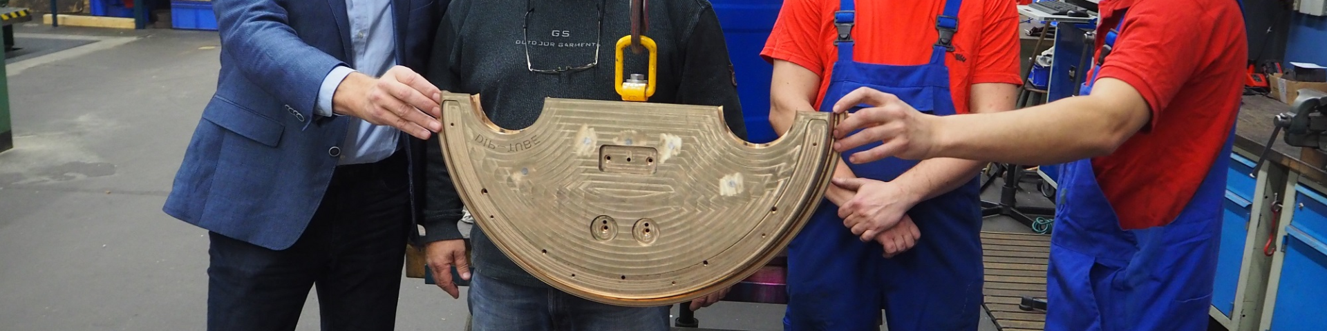 Bildunterzeile: (von links) Peter Lang, Geschäftsführer von ALBROMET neben Projektmanager Ralf Gräve und den Werkzeugmonteuren Johannes Fastenrath und Johann Dirksen von Kremann + Esser mit einem Bauteil für Fässer aus dem Werkstoff W164. Bild: ALBROMET