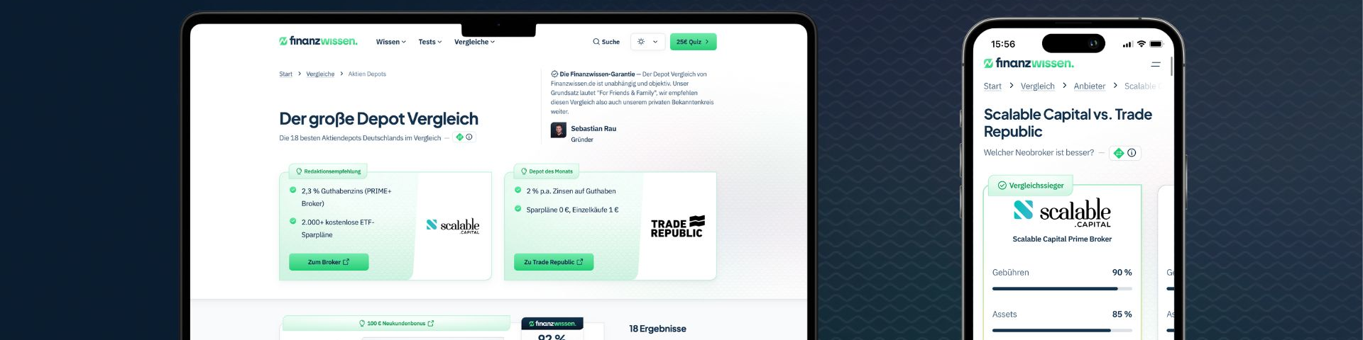 Mit dem neuen 1 vs. 1 Anbietervergleichs-Tool könnt ihr Finanzanbieter gezielt miteinander vergleichen, um den für euch besten Anbieter zu finden. Einen größeren Überblick bieten dann unsere Vergleiche, wie zum Beispiel unser Vergleich der besten Aktien-Depots. Hier wirst du das optimale Depot für deine individuellen Bedürfnisse finden.