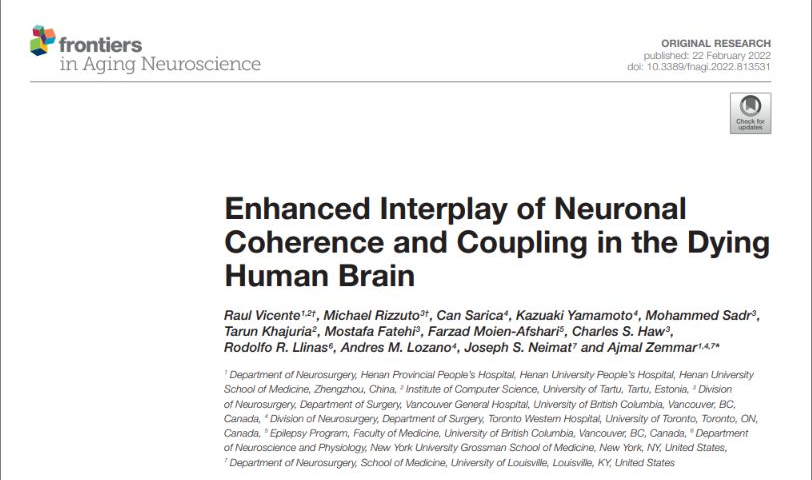 Vicente R, Rizzuto M, Sarica C, Yamamoto K, Sadr M, Khajuria T, Fatehi M, Moien-Afshari F, Haw CS, Llinas RR, Lozano AM, Neimat JS and Zemmar A (2022) Enhanced Interplay of Neuronal Coherence and Coupling in the Dying Human Brain. Front. Aging Neurosci. 14:813531. doi: 10.3389/fnagi.2022.813531