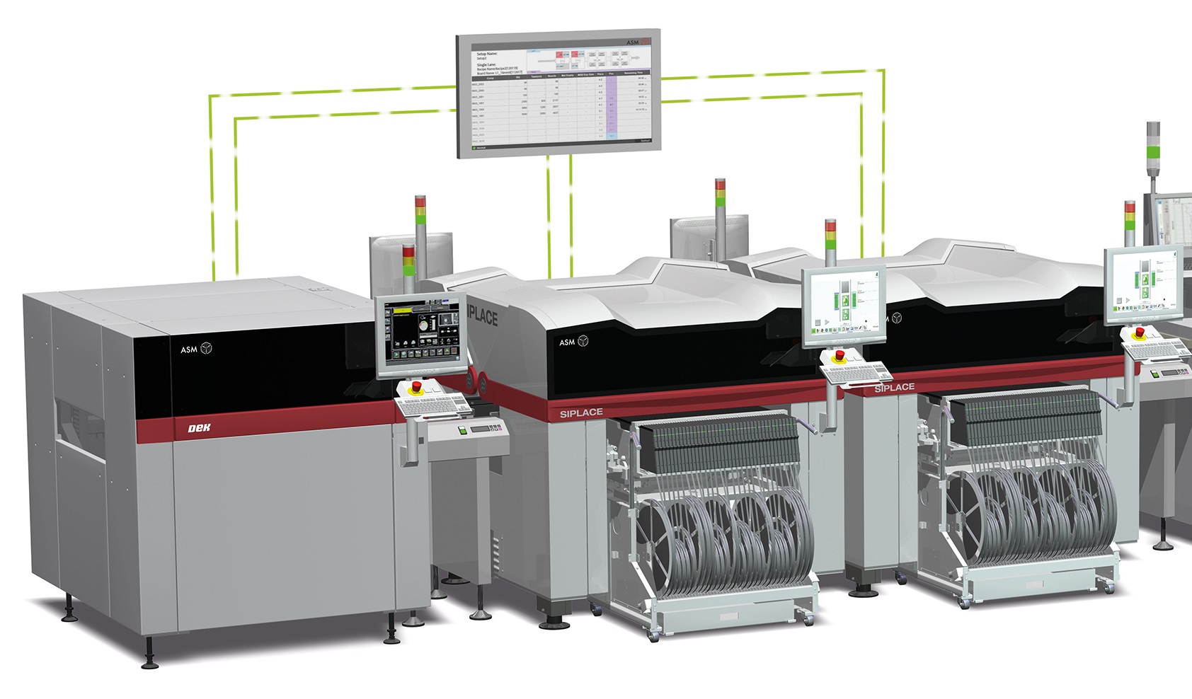 ASM Lösungen wie die SIPLACE Placement Systems und die DEK Printing Solutions unterstützen auf Linien- und Fabrikebene mit Hardware, Software und Services die Vernetzung, Optimierung und Automatisierung von zentralen Workflows und erlauben Elektronikfertigern somit den schrittweisen Übergang zur Smart SMT Factory mit dramatischen Verbesserungen bei Kennzahlen/KPIs für Produktivität, Flexibilität und Qualität.