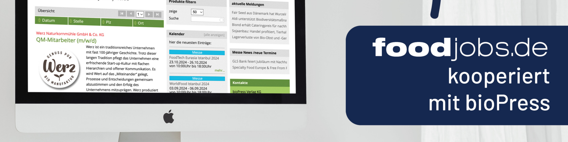 foodjobs.de ist das Jobportal für die Menschen hinter den Lebensmitteln. Wer in der Lebensmittelwirtschaft ein- und aufsteigen möchte, findet in foodjobs.de einen kompetenten Karrierebegleiter mit passenden Job- Angeboten, Orientierungshilfestellungen und konkreten Tipps. Als lebensmittelspezifische Jobbörse unterstützt foodjobs.de Unternehmen bei der gezielten Personalsuche und beim Employer Branding. Speziell für die Biobranche kooperiert foodjobs.de ab sofort mit bioPress, dem Fachmagazin für Naturprodukte.