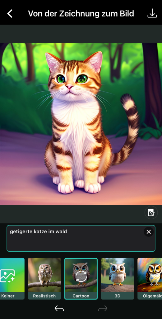 KI-Bilder aus einer eigenen Zeichnung generieren wird mit der neuen KI-Funktion Skizze zu Bild Wirklichkeit. Dabei gibt eine eigene Zeichnung in der App die Struktur eines gewünschten Bildes vor, beispielsweise die Darstellung eines Hauses, einer Landschaft oder eines zu gestaltenden Innenraums. Über einen zusätzlichen Text-Prompt werden weitere Details und Informationen zum gewünschten Ergebnis hinzugefügt. Wird ein Umriss von einem Vogel skizziert und dazu im Textfeld Blaumeise zum Prompt notiert sowie ein gewünschter Stil gewählt, zeigt die App im Ergebnis ein Bild von dieser Vogel-Art mit entsprechendem Hintergrund oder Ambiente an.