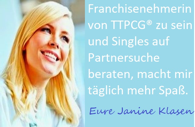 Durch meinen Mann Klaas, der seit 2015 zu seinem Job als Verkaufstrainer als nebenberuflicher Franchise-Nehmer für die Partnervermittlung TTPCG® startete und von mir unterstützt wird, wurde auch ich nebenberufliche Franchise-Nehmerin der TTPCG®, einer bereits 1981 gegründeten Partnervermittlung, welche in vielen Ländern eine preisgünstige Dienstleistung bietet, welche ständig international ausgezeichnet wird. Inzwischen sind wir beide hauptberufliche Franchise-Nehmer der TTPCG® und beraten Singles, die den wirklich passenden Lebenspartner*in über TTPCG DATING SERVICES ® schnell kennenlernen wollen.