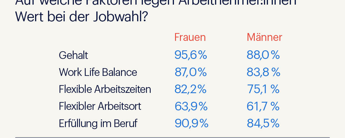 28,3% der Frauen sagen sogar, dass Arbeit in ihrem Leben sehr wichtig sei. Unter den Männern dagegen sind es nur 20,9%. Insgesamt wünschen sich Frauen mit 90,9% häufiger Erfüllung im Beruf als Männer (84,5%). Welche Faktoren spielen für ein erfülltes Berufsleben eine Rolle? Für 87% der befragten Arbeitnehmerinnen ist bei der Jobwahl die Work-Life-Balance wichtig (Männer: 83,8%), 82,2% legen Wert auf flexible Arbeitszeiten (Männer: 75,1%).