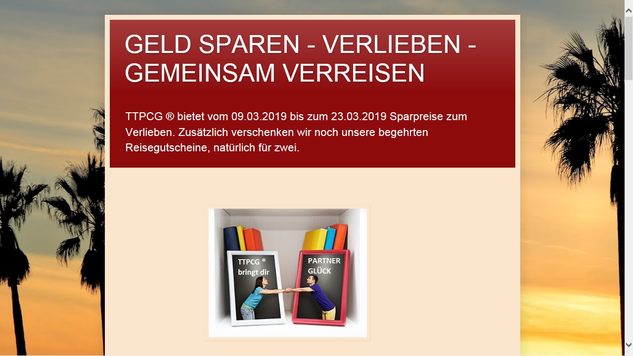 TTPCG ® ist bekannt als low prices Partnervermittlung. Ab dem 09.03.2019 gibt es bei TTPCG ® Rabatte für dich. Dazu schenkt dir TTPCG ® einen Gutschein, natürlich für dich und deine neue Liebe, mit diesem Gutschein könnt ihr gemeinsam und frisch verliebt einen Kurzurlaub erleben. Gratis kannst du TTPCG ® unter www.taylorgroup.ch schon mal testen.