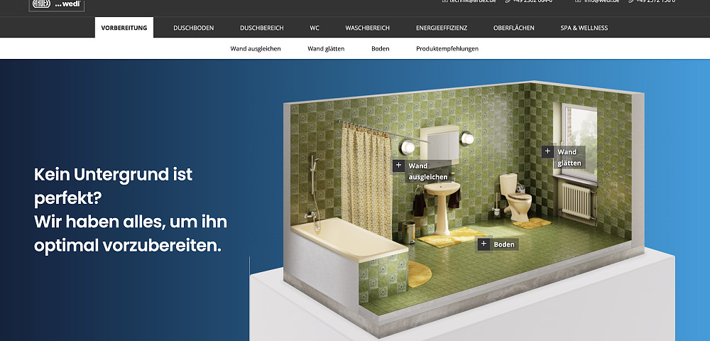 Dementsprechend ist die Ardex-wedi-Website modular aufgebaut – und gibt konkrete Antworten. Wie geht es weiter, wenn die alten Fliesen und die Sanitärobjekte weg sind? Was mache ich, wenn an den Wänden Steine ausgebrochen oder noch Kleberreste vorhanden sind? Jeder Arbeitsschritt von der Untergrundvorbereitung über den Duschbereich bis hin zu den Oberflächen wird genau beschrieben und mit den passenden Produkten verknüpft. „Die Profis können entweder die einzelnen Schritte nacheinander durchgehen oder sich einzelne Punkte herausgreifen – je nach Bedarf“, erklärt Markus Stolper.