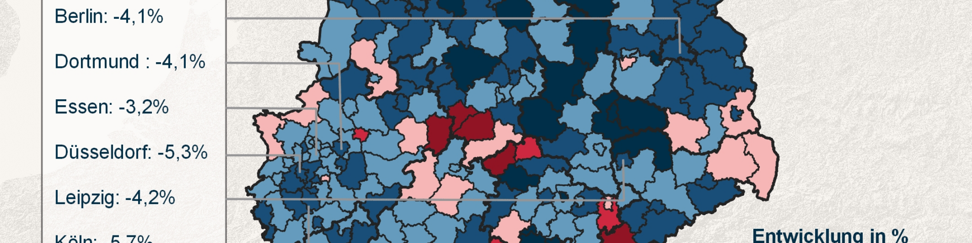 Die Analyse basiert auf einer umfassenden Datenbasis von knapp 2 Millionen Kaufangeboten auf regionaler Ebene, die alle 400 deutschen Kreise und kreisfreien Städte abdecken. Zur Sicherstellung repräsentativer Ergebnisse wurden Extremwerte und Ausreißer innerhalb der Angebotsverteilung mithilfe statistischer Verfahren entfernt. Die prozentuale Entwicklung im Vergleich zum Vorjahr wurde berechnet und dargestellt.