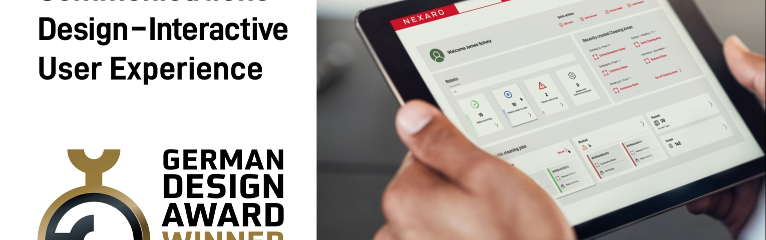 Wuppertal, Dezember 2023 – Mit seiner Cobotic-Systemlösung ist das Wuppertaler Technologie-Start-Up Nexaro angetreten, um die gewerbliche Gebäudereinigungsbranche zu revolutionieren. Maßgeblicher Faktor für den Erfolg der Lösung ist auch die Akzeptanz der Reinigungsunternehmen und -fachkräfte für den disruptiven Nexaro Ansatz. Entsprechend stand die intuitive Handhabung und ein hochwertiges, ansprechendes Design im Mittelpunkt bei der Entwicklung des Nexaro HUBs, der zentralen Steuersoftware des Gesamtsystems. Nun zeichnet die Jury des German Design Awards den Nexaro HUB mit dem German Design Award als „Winner“ in der Kategorie „Excellent Communications Design – Interactive User Experience“ aus.