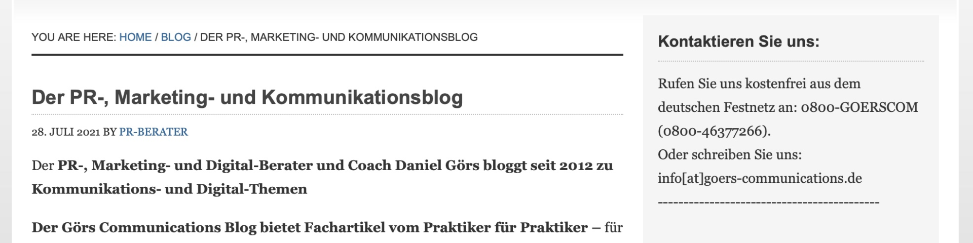 Bevor er seinen „Görs Communications Blog“ vor neun Jahren startete, war der Diplom-Sozialwirt PR- und Marketingberater in namhaften Hamburger Agenturen, geschäftsführender Gesellschafter einer Werbe- und Internetagentur sowie PR-Manager, Pressesprecher und Leitung Corporate Communications für Internetportale von Axel Springer und der Scout24-Gruppe / Deutsche Telekom. 2012 starte sein PR-, Marketing- und Digitalberatungsunternehmen Görs Communications ( https://www.goers-communications.de ) und damit auch der Blog. Seine Erfahrungen und Spezial-Know-how, die Daniel Görs während seiner zwanzigjährigen Kommunikations- und Beratungspraxis gesammelt hat, lässt er nicht nur im Consulting und Coaching für seine Kunden einfließen, sondern auch im Blog. „Der Görs Communications Blog ist vom Praktiker für Praktiker im Kommunikationsbereich“, betont der PR- und Marketingexperte, „aber es freut mich, dass auch Studierende und Einsteiger die Artikel nutzen.“ Denn „Evergreen-Content“ wie beispielsweise “ Was macht eigentlich ein PR-Berater und was ist PR-Beratung?“ oder die “ Anleitung: Presseverteiler selbst erstellen“ bietet seit Jahren einen guten Einstieg in PR- und Kommunikationsthemen und wird entsprechend gut in den Suchmaschinen gerankt (SEO) und häufig gelesen.