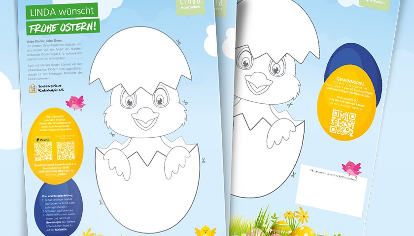 Ein süßes Osterküken ist in diesem Jahr das Motiv der LINDA Malvorlagen. Ab dem 15. März 2023 können sie Eltern mit ihren Kindern in ihrer LINDA Apotheke vor Ort abholen. Wo sich diese befindet, lässt sich ganz einfach über den Apothekenfinder auf linda.de heraussuchen. Dort stehen auch zusätzlich die Malvorlagen unter der Rubrik „LINDA. HILFT.“ zum Download bereit.