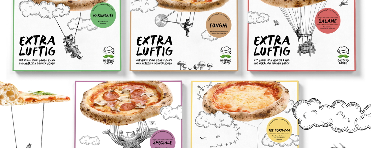 Damit sich die neue Linie auch optisch von den bisherigen Gustavo-Gusto-Tiefkühlpizzen unterscheidet, wurde ein völlig neues und auffälliges Verpackungsdesign geschaffen – allerdings ohne die bisherige Marken-DNA zu verlieren. „Mit der weißen Farbe und den handgemalten Illustrationen bleiben wir unseren Design-Grundsätzen treu. Allerdings steht hier nicht der Text, sondern die Illustration im Fokus. Die Kombination aus Pizza und liebevoller Kupferstich-Malerei inszeniert ganz klar den Produktvorteil“, erklärt Marketingchef Michael Götz. „Man erkennt auf den ersten Blick: Diese Pizza ist extra luftig – und wortwörtlich ein Hochgenuss.“