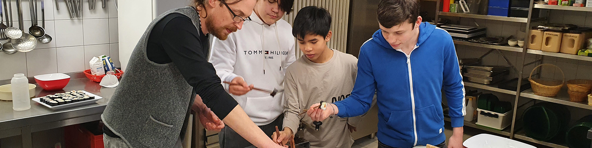 Für besonderen Spaß beim Kochen gibt es ganzjährig verschiedene Aktionen und Kurse. Hierbei erlernen die Schüler*innen nicht nur wichtige Grundlagen des Kochens sondern werden auch an die Zubereitung verschiedener internationaler Speisen wie z.B. Sushi herangeführt. Im Team verschiedene Vor-, Haupt- und Nachspeisen vorzubereiten, zu kochen und anschließend gemeinsam zu essen, schärft die Sinne und wird zum sozialen und kulturellen Ereignis.