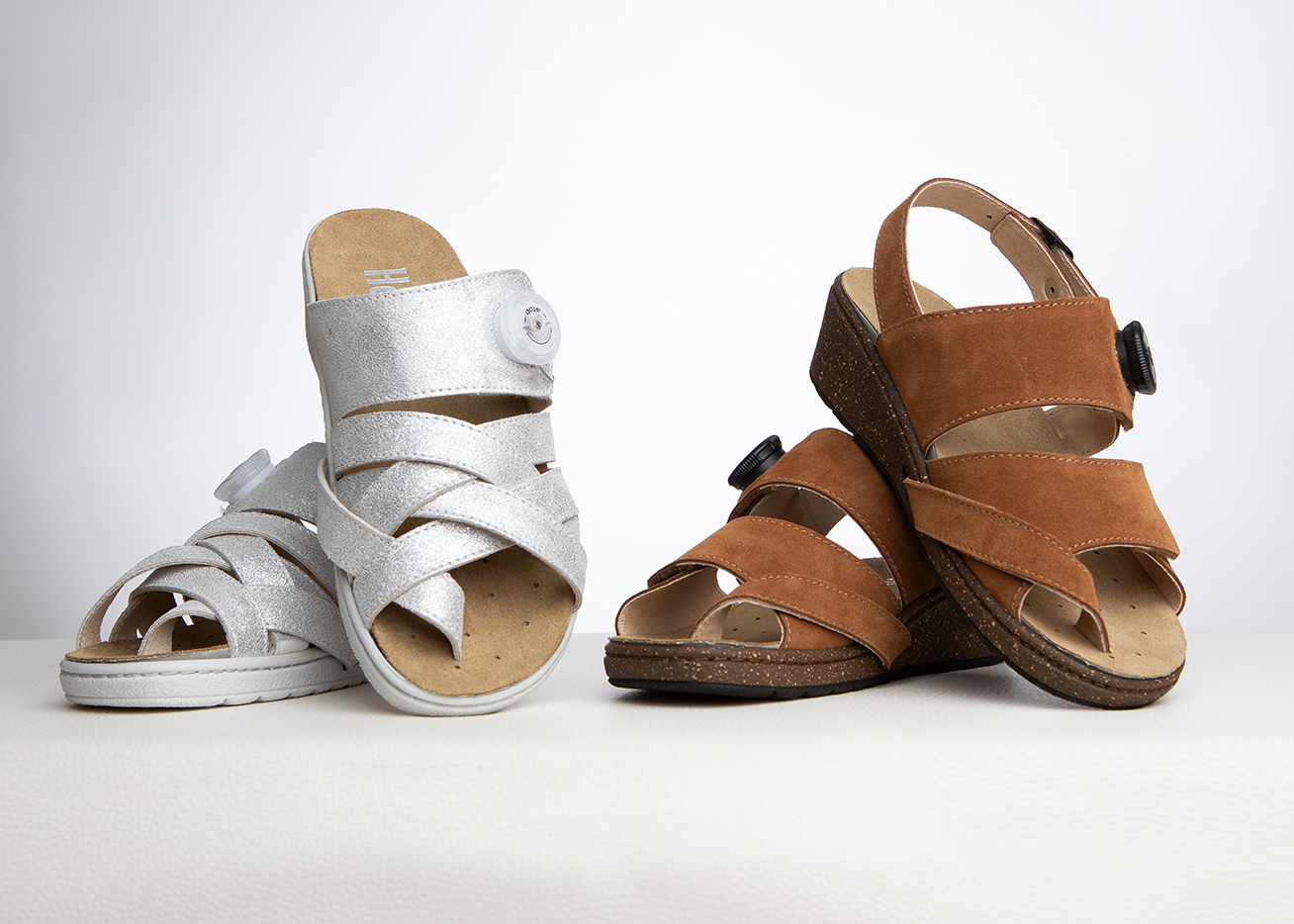 Die formschöne Veloursledersandale GinkGo ist im Pantoletten-Design gestaltet. Ein zusätzlicher Fersenriemen sorgt für eine optimale Passform. LowGo ist eine Velourslederpantolette in elegantem dunkelblau und die offene Pantolette TenGo überzeugt durch ihre modische Silberoptik. Damit müssen Betroffene endlich nicht mehr auf Sandalen verzichten!