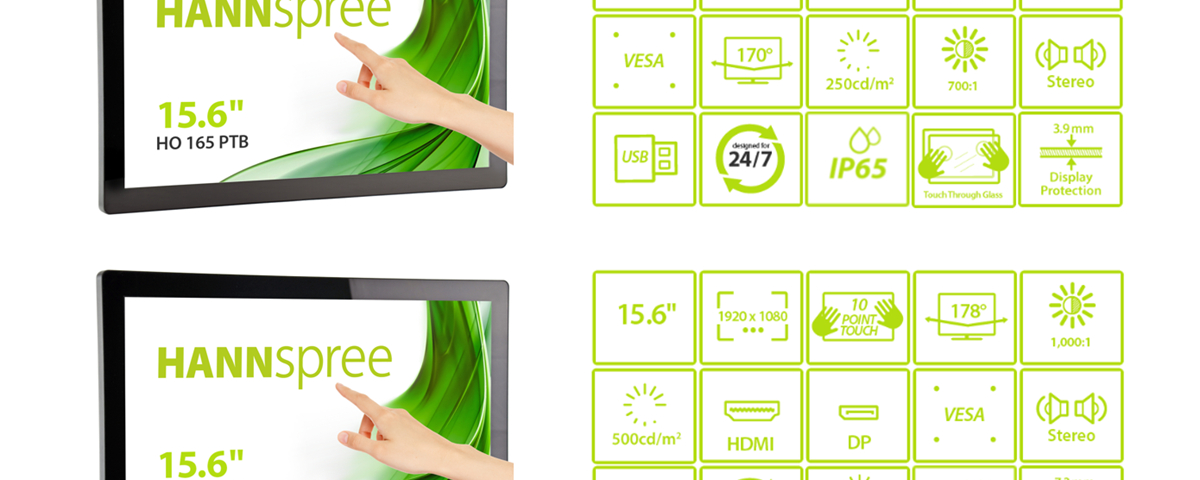 Meerbusch, Deutschland, 25. August 2020 – HANNspree stellt zwei neue 15,6-Zoll-Touchscreen-Displays der HO Open-Frame-Monitore vor. Bei den beiden Modellen HO165PTB und HO165PGB handelt es sich um fortschrittliche Touch-Lösungen für die Hardware-Integration mit P-Cap-Touch-Technologie. Beide Displays sind dahingehend konzipiert, dass sie durch das verwendete Schutzglas den physischen Anforderungen in öffentlichen Räumen sowie Umwelteinflüssen standhalten und Flexibilität bei Design und Konnektivität bieten, um verschiedene Integrationsanwendungen zu ermöglichen.