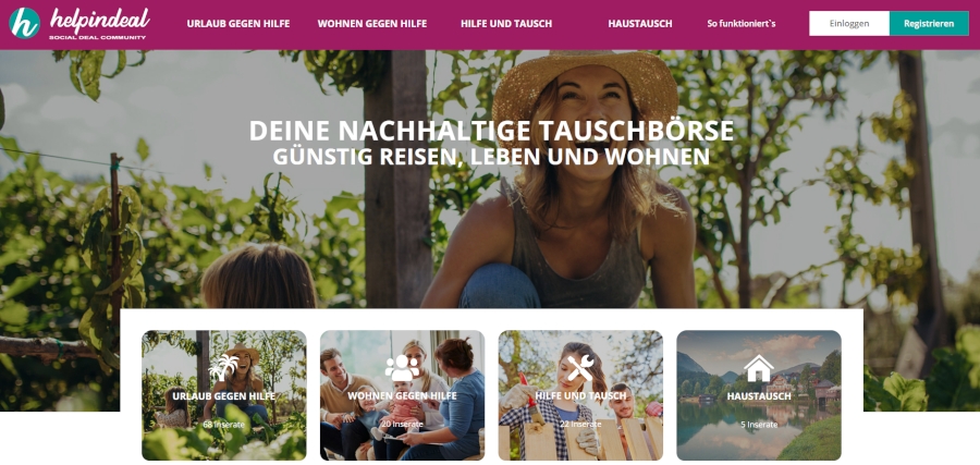 Auf helpindeal steht der gegenseitige Austausch im Vordergrund – ein Geben und Nehmen. Es gibt verschiedene Tauschkategorien, unter anderem auch der Haustausch. Hier kann Wohnraum dauerhaft oder nur für einen Urlaub getauscht werden. Die Mitglieder profitieren von Transparenz durch ein gegenseitiges Bewertungssystem, verifizierten Mitgliedschafts-Profilen, ein Vereinbarungsdokument, um spezielle Wünsche wie Ankunftszeit und andere Gegebenheiten festzuhalten, und vielen weitere Leistungen.