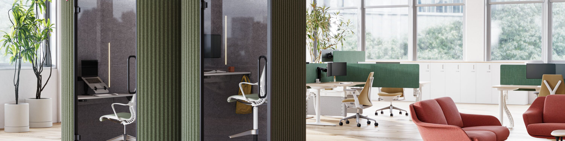 Der Bay Work Pod von Herman Miller ist eine inklusive und flexible Einzelarbeitsplatzlösung, die auf Konzentration und Komfort ausgelegt ist.
