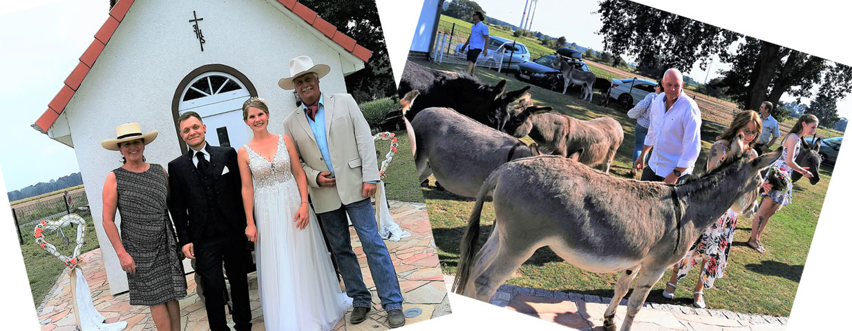 Unter Beachtung der Corona-Auflagen gaben sich unter dem Christus-Kreuz an der St. Leonhard Kapelle zunächst Bettina und Dietmar Stuwe aus Penningsehl (Landkreis Nienburg) vor der Standesbeamtin Kim Meyer das Ja-Wort. Neben ihrer kleinen Hochzeitsschar, gehörten auch die Esel der Gut Aiderbichl Ballermann Ranch zu den ersten Gratulanten des Paares.