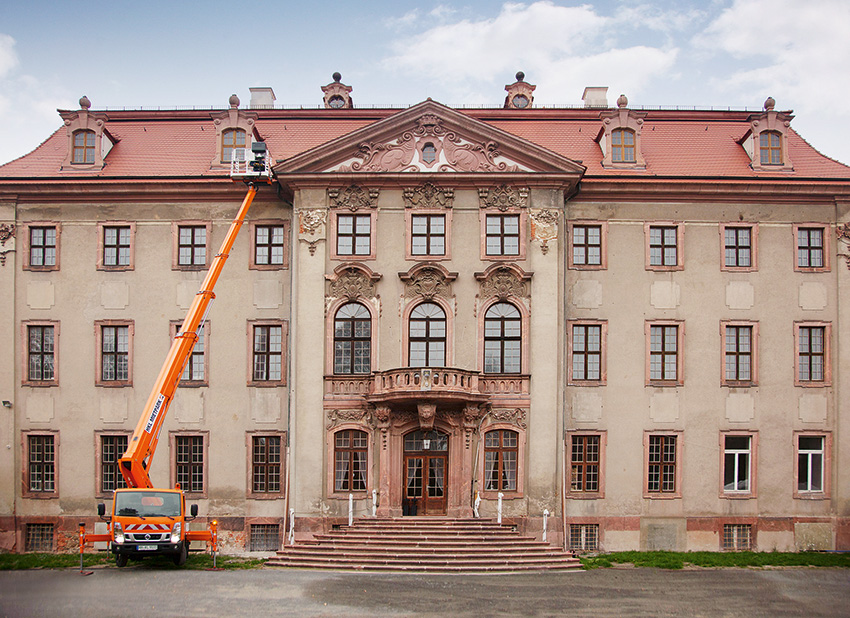 Leipzig, 11. Februar 2019 – Die Geschichte von Schloss Brandis östlich von Leipzig reicht bis ins 18. Jahrhundert zurück. Nach mehreren unterschiedlichen Nutzungen wurde das Barockschloss mit Schlossgarten ab 2006 in eine Wohnanlage umgebaut. Diese wird derzeit aufwendig und unter strengen Auflagen durch das Landesamt für Denkmalpflege saniert, ebenso der zugehörige Schlosspark. Die zuständige RS Schlossresidenz GmbH mietete hierfür eine Arbeitsbühne aus dem HKL Arbeitsbühnen- und Teleskopcenter in Leipzig, die sie für unterschiedliche Aufgaben nutzt.