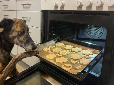 „Wenn die Hunde in die Küche dürfen, kann dort durch gemeinsames Backen eine aufregende Aktivität entstehen, die Mensch und Tier verbindet.“ Ströhlein rät dazu, das Rezept Schritt für Schritt in leisem, aber motivierenden Ton vorzulesen und die Hunde aktiv einzubeziehen, etwa durch das Schnüffeln an Kräutern oder das Probieren des Teigs. Zudem kann ein kleiner Teil des geschnippelten Obsts oder der verwendeten Wurst abgegeben werden. Und auch beim Ausstechen der Kekse mit der Pfote oder dem Hineinschieben der Bleche in den Ofen können Hunde mit etwas Geduld und Geschick spielerisch beteiligt werden. Bei Mehrhundehaltern einmal die eine, einmal die andere Fellnase. Oder alle nacheinander.