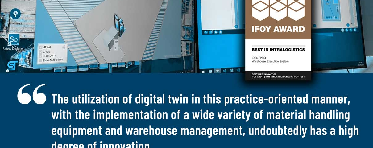 Die IFOY-Jury würdigte IdentPro und betonte: „Die Nutzung des digitalen Zwillings auf diese praxisorientierte Weise mit der Implementierung verschiedenster Materialflusstechnik und Lagerverwaltung hat zweifellos einen hohen Innovationsgrad.“ Die Jury hob besonders die fortschrittliche Umsetzung des digitalen Zwillings in Echtzeit hervor, der eine effiziente Steuerung und Optimierung der Lagerprozesse ermöglicht.