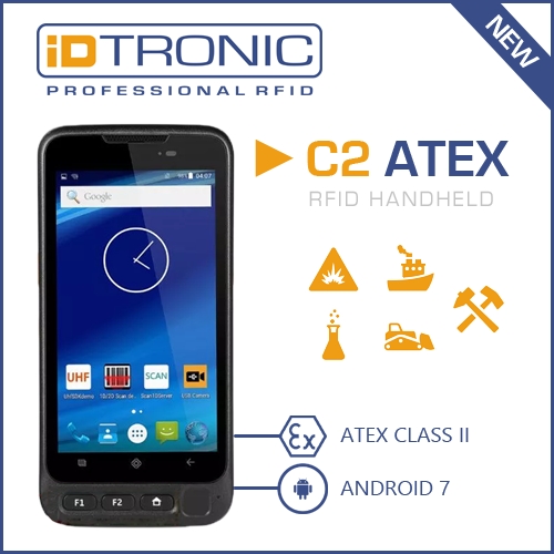 iDTRONIC als führender Anbieter für robuste und leistungsstarke RFID Handheld Reader hat ein neues mobiles Handlesegerät auf den Markt gebracht. iDTRONIC hat zusammen mit seinem Partner ein widerstandsfähiges und handliches RFID Lesegerät für explosionsgefährdete Zonen entwickelt. Die Besonderheit des neuen C2 ATEX liegt in der ATEX Class II Zertifizierung (2014/34/EU: II 2 G Ex ib IIC T3 Gb, II 2 D Ex tb III T3 Db). Es ist widerstandsfähig gegen chemische Stoffe, raue Umgebungen mit hohem Staubaufkommen oder Steinschläge. Typische Einsatzgebiete für das C2 ATEX sind: Explosions-gefährdete Gebiete, Chemische Industrie, Erdöl-Industrie, Baustellen und Bergbau.