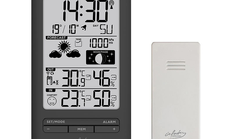 Mit der Funk-Wetterstation von infactory wird man zum Wetter-Experten: Der Helfer liefert alle relevanten Wetterdaten direkt ins Zimmer. Zudem zeigt er den Wettertrend an.